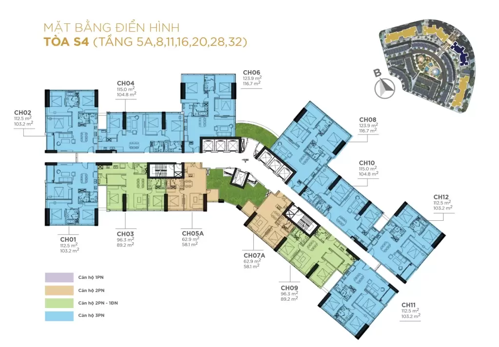 Loại hình căn hộ: Đa dạng, bao gồm các loại căn hộ từ 1 đến 3 phòng ngủ, với các diện tích khác nhau: